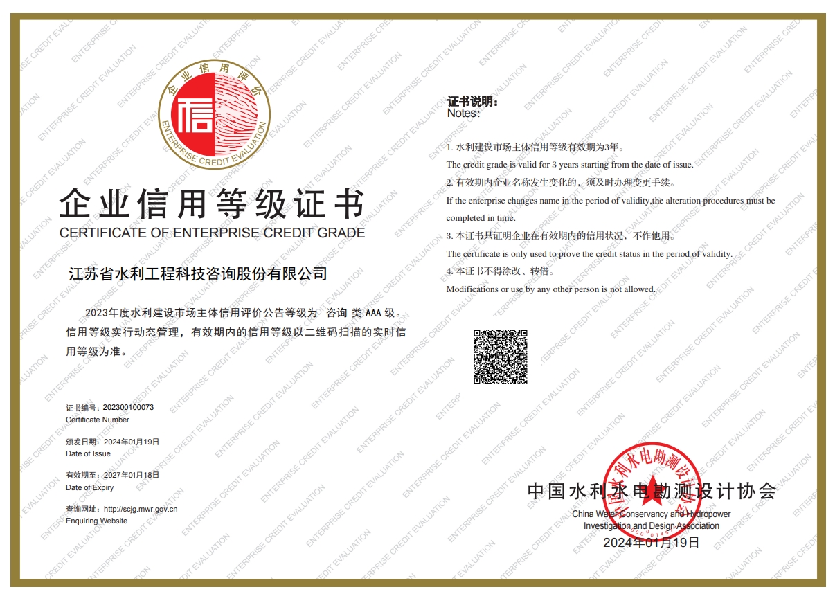 近日,中國水利水電勘測設計協(xié)會正式發(fā)布2023年度水利建設市場主體信用評價結果公告,我公司榮獲咨詢單位信用評價最高殊榮AAA等級。