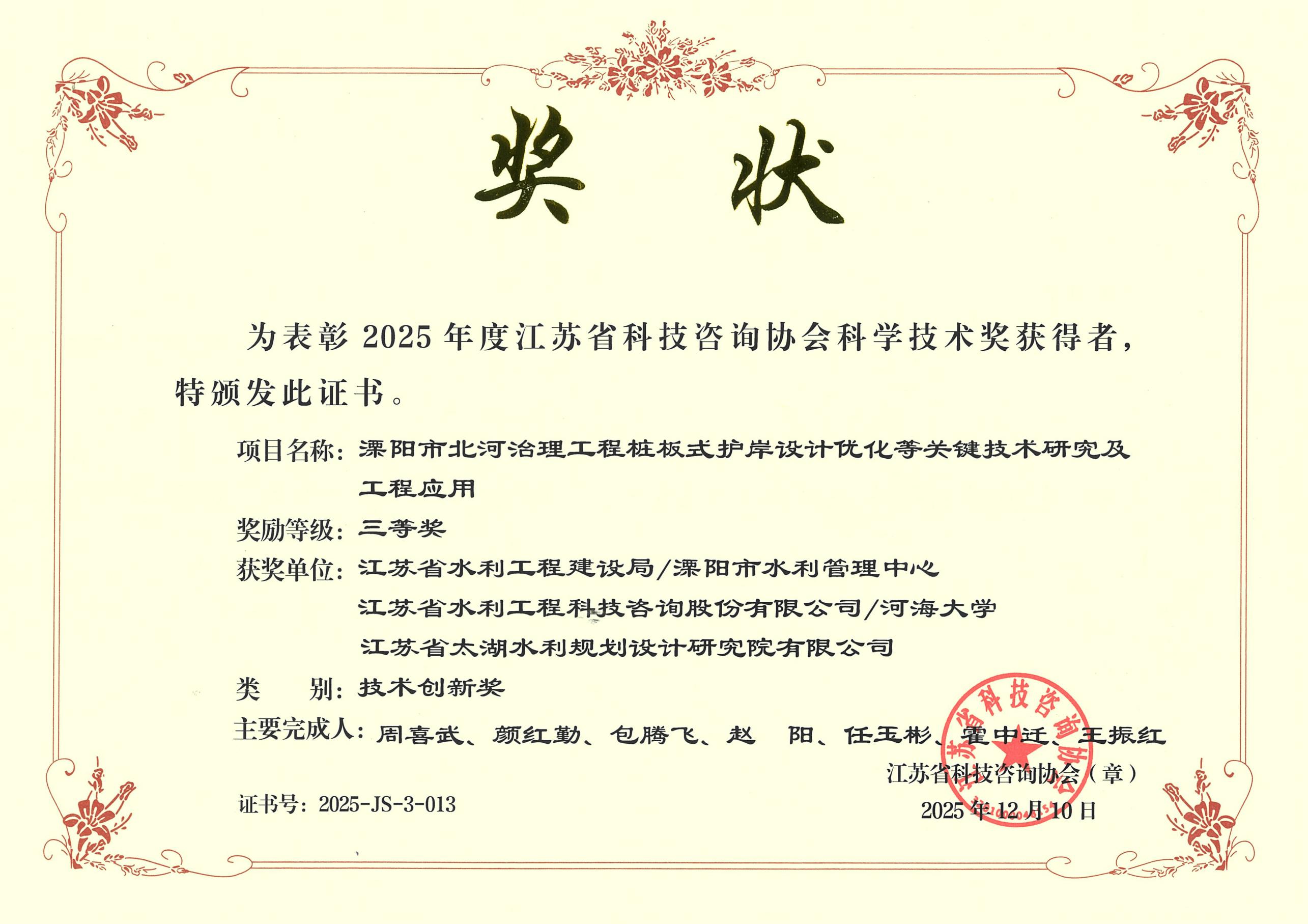 > 技術(shù)創(chuàng)新三等獎(jiǎng) 漂陽市北河治理工程樁板式護(hù)岸設(shè)計(jì)優(yōu)化等關(guān)鍵技術(shù)研究及工程應(yīng)用 三等獎(jiǎng)