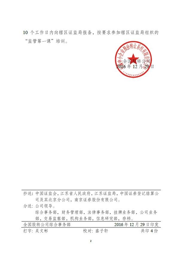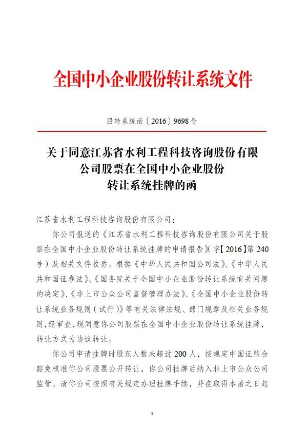 2016年12月29日,我公司正式收到全國(guó)中小企業(yè)股份轉(zhuǎn)讓系統(tǒng)的復(fù)函,同意掛牌上市。 全國(guó)中小企業(yè)股轉(zhuǎn)系統(tǒng)公告顯示,江蘇省水利工程科技咨詢(xún)股份有限公司(證券簡(jiǎn)稱(chēng):水利咨詢(xún) 證券代碼:870619)的掛牌申請(qǐng)獲得批準(zhǔn)。本次掛牌上市的主辦券商為南京證券,法律顧問(wèn)為北京大成(南京)律師事務(wù)所,財(cái)務(wù)審計(jì)為亞太(集團(tuán))會(huì)計(jì)師事務(wù)所(特殊普通合伙)。 本次掛牌新三板,為公司更快、更好發(fā)展增加了強(qiáng)大動(dòng)力,具有非常重要的意義。接下來(lái),我們會(huì)抓住江蘇水利改革發(fā)展的新機(jī)遇,深化改革,開(kāi)拓創(chuàng)新,為公司的發(fā)展壯大而繼續(xù)努力。