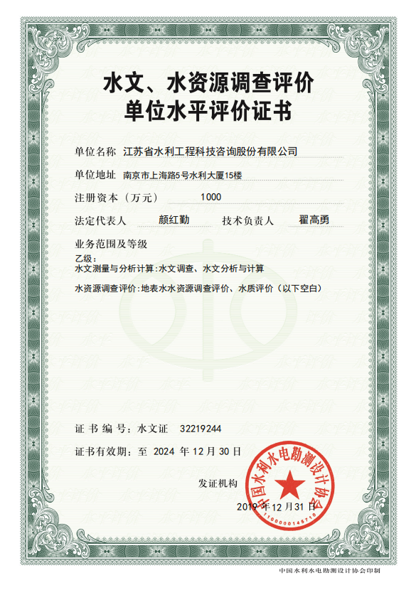 經(jīng)中國水利水電勘測(cè)設(shè)計(jì)協(xié)會(huì)核準(zhǔn),我公司取得水資源論證單位水平評(píng)價(jià)乙級(jí)證書,證書編號(hào)為水論證320219072,水文、水資源調(diào)查評(píng)價(jià)單位水平評(píng)價(jià)乙級(jí)證書,證書編號(hào)為水文證32219244。