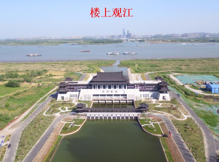 揚州市瓜洲泵站工程站址位于古運河南端瓜洲閘東側,距長江堤防150m,泵站設計規(guī)模為170m3/s,設計凈揚程1.88m,最大凈揚程2.72m,選擇6臺立式全調節(jié)軸流泵(3000ZLQ-28.4),單機設計流量為28.4m3/s,水泵配套1600kW高壓同步電機,總裝機容量9600kW。采用肘型進水流道、虹吸式出水流道,真空破壞閥斷流。主機組采用液壓全調節(jié)的方式調節(jié)葉片角度,液壓裝置設置2套。批復總投資4.03億元。瓜洲泵站被譽為揚州“城市安全第一工程”,揚州濱江枕淮,是全國唯一地處兩大流域交匯點城市,一旦遭遇江潮頂托、淮水并漲,城市澇水外排不暢。瓜洲泵站建成后,提高了揚州市主城區(qū)水動力條件,有效實現主城區(qū)清水、活水,改善水質和水生態(tài)環(huán)境;提升了區(qū)域、流域防洪排澇能力,2020年汛期抽水量達3.23億m3,保障了揚州城區(qū)“不淹不澇”。 瓜洲泵站建筑設計新穎。理念:打造園林景觀水利樞紐;創(chuàng)新:建筑整體外觀采用唐式古典建筑,高層廠房將古城墻與重檐歇山頂完美融合,實現 “橋上觀樓,樓上觀江” 。體現了東方特有的審美情趣,美一是對稱美。美二是建筑群高低錯落有致,別有風味。將盛唐建筑出檐深遠、磅礴大氣特點與水工建筑物恢弘的氣勢相結合。立面設計上,用揚州傳統(tǒng)建筑色彩、白色和玻璃構筑一個簡潔大氣、有著獨特內涵的水利樞紐。與古運河、長江交相輝映,彰顯瓜洲古鎮(zhèn)、古渡文化特征。瓜洲泵站即將成為揚州市又一張亮麗名片和長江邊上一道靚麗風景線。
