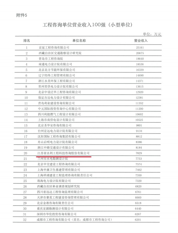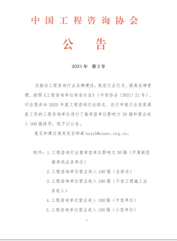 10月26日,我公司榮獲“工程咨詢單位營業(yè)收入100強(qiáng)(小型單位)”稱號。由中國工程咨詢協(xié)會(huì)發(fā)起的工程咨詢行業(yè)智庫單位影響力30強(qiáng)、工程咨詢單位營業(yè)收入100強(qiáng)榜單發(fā)布,肯定了我公司在體制機(jī)構(gòu)改革、工程咨詢服務(wù)數(shù)字化、全過程咨詢、疫情防控、脫貧功堅(jiān)等工作上的成績。
